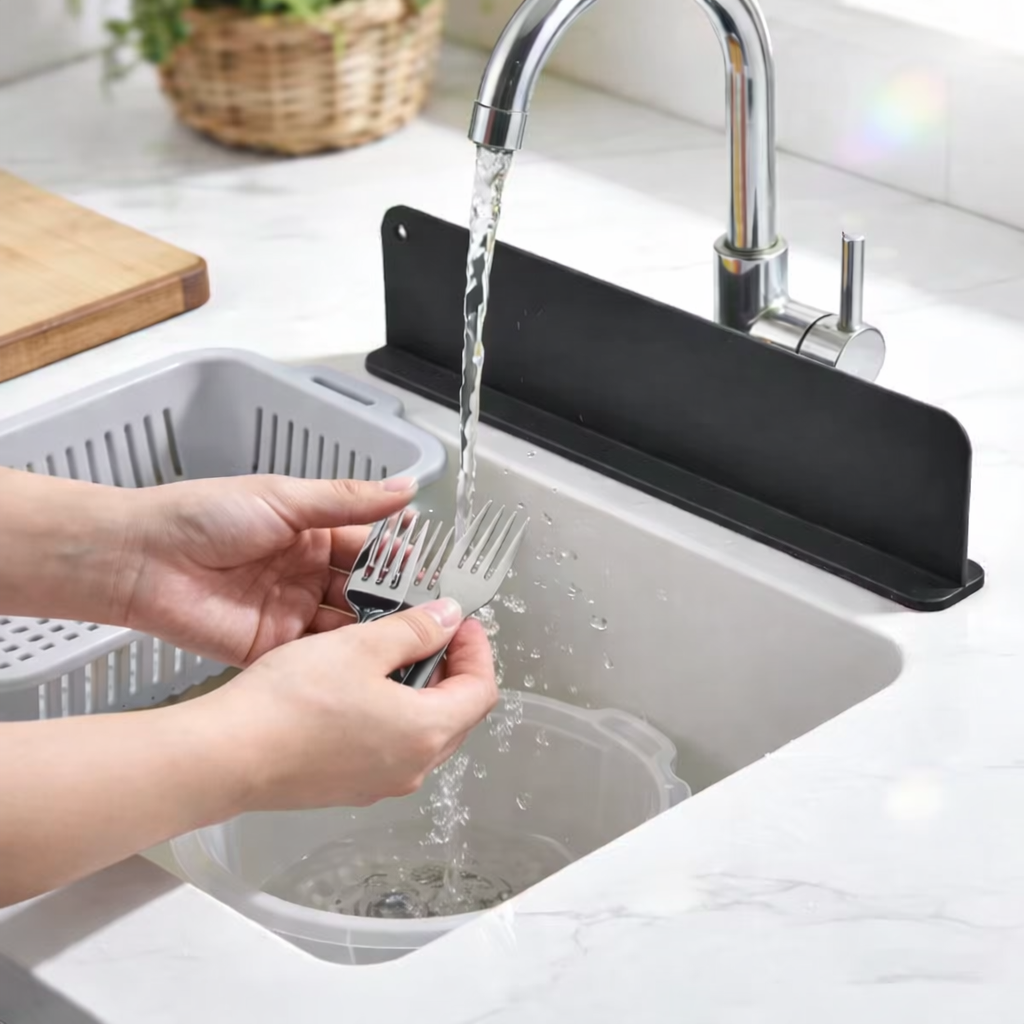 SplashShield™ is a sleek, low-profile sink splash guard designed to block water splashes before they reach your countertop. Whether you’re washing dishes, rinsing produce, or cleaning utensils, SplashShield helps keep your sink area tidy and mess-free.